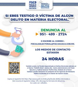 Las denuncias pueden hacerse vía telefónica a través del número 951 499 27 24, o bien está la opción de escribir al correo electrónico fiscaliaelectoral@fge.oaxaca.gob.mx, también pueden acudir a las instalaciones de la Fiscalía Especializada en Delitos Electorales que está ubicada en el Núcleo “Rodolfo Nieto”, planta alta, en el Centro Administrativo del Poder Ejecutivo y Judicial General “Porfirio Díaz, Soldado de la Patria”, o en cualquiera de las agencias del Ministerio Público localizadas en el interior del estado.