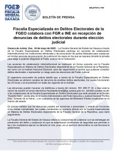 Oaxaca de Juárez, Oax. 30 de mayo de 2025.- La Fiscalía General del Estado de Oaxaca a través de la Fiscalía Especializada en Delitos Electorales participa en acciones de colaboración interinstitucional con instituciones electorales y de procuración de justicia federales para coadyuvar en brindar servicios de procuración de justicia en los casos en los que se requiera durante la jornada para elegir a quienes integrarán el Poder Judicial de la Federación.