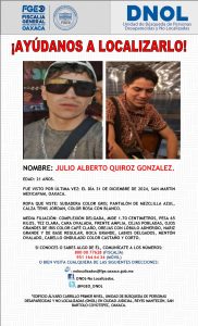 Oaxaca de Juárez a 13 de enero de 2025.- La Fiscalía General del Estado de Oaxaca (FGEO) realiza acciones especializadas luego de recibir las denuncias por la No Localización de seis personas, quienes fueron vistas por última vez entre el 31 de diciembre de 2024 y el 7 de enero de 2025, en diferentes puntos de la región de los Valles Centrales.
