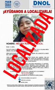 Mientras que, el segundo caso se trata de una adolescente identificada como M.R.D., quien fue reportada como No Localizada, señalando que se le vio por última vez cuando salió de su domicilio en la colonia Niños Héroes, en el municipio de Santa María Atzompa, quien ya fue localizada y restituida con su familia.