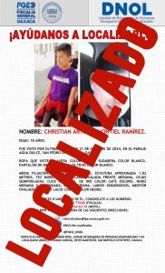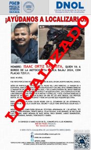 En tanto que, la Fiscalía de Oaxaca también recibió una denuncia por la No Localización de I.O.B., quien fue visto por última vez al salir de su domicilio ubicado en el municipio de San Jacinto Amilpas, a partir de lo cual se realizaron los trabajos que permitieron su localización.