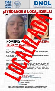 Mientras que, D.Y.J.R. fue vista por última vez al salir de su domicilio ubicado en el municipio de Ejutla de Crespo, quien ya fue localizada y restituida con su familia.