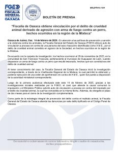 Luego de la primera audiencia efectuada este este 14 de febrero de 2025, gracias a las investigaciones iniciales realizadas por la FGEO, el Juez que atiende la causa comunicó la imputación y el Ministerio Público solicitó auto de vinculación a proceso en contra del imputado por el delito de crueldad animal, la cual fue concedida en la misma fecha. Además, de otorgarle el plazo de dos meses para el cierre de la investigación complementaria.