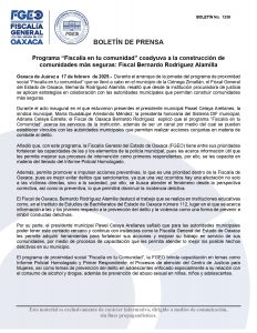 El programa de proximidad social “Fiscalía en tu Comunidad”, la FGEO brinda capacitación en temas como Informe Policial Homologado y Primer Respondiente, el Procesos de atención del Centro de Justicia para Mujeres, así como temas de prevención del delito en adolescentes enfocado especialmente a su relación con el consumo de alcohol y drogas, además de prevención del abuso sexual en niñas, niños y adolescentes.