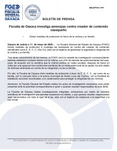 Oaxaca de Juárez a 11  de mayo de 2025. –   La Fiscalía General del Estado de Oaxaca (FGEO) brinda medidas de protección e investiga las amenazas en contra del creador de contenido identificado como E. G. C. C. (Gio Cz), esto con el objetivo de garantizar la seguridad e integridad de la víctima y su familia.