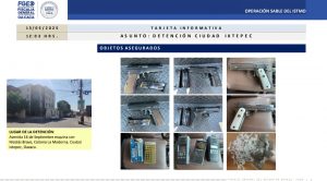 El Fiscal Bernardo Rodríguez puntualizó que el 14 de mayo se logró la detención en flagrancia de tres personas, a quienes les aseguraron armas de fuego y dosis de diversas drogas, además una de las personas detenidas, la cual es identificada como A.P.R. estaba siendo buscado por su probable participación en diferentes actividades ilícitas relacionadas con la delincuencia organizada en la zona noroeste del país.