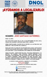 Oaxaca de Juárez, Oax., a 17 de septiembre  de 2025.-  En coordinación con autoridades estatales y federales, la Fiscalía General del Estado de Oaxaca (FGEO)  implementa un operativo de búsqueda y localización de José Santiago Gutiérrez, de 62 años, mediante acciones estratégicas realizadas por equipos multidisciplinarios en Santiago Amoltepec.