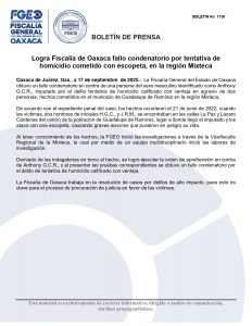 Oaxaca de Juárez, Oax., a 18 de septiembre  de 2025.-  La Fiscalía General del Estado de Oaxaca obtuvo un fallo condenatorio en contra de una persona del sexo masculino identificado como Anthony G.C.R., imputado por el delito tentativa de homicidio calificado con ventaja en agravio de dos personas, hechos cometidos en el municipio de Guadalupe de Ramírez en la región Mixteca.