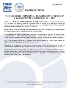 Oaxaca de Juárez, Oax., a 19 de septiembre de 2025.- La Fiscalía General del Estado de Oaxaca (FGEO) define y fortalece las líneas de investigación por los hechos en los que perdió la vida una adolescente, en el Istmo de Tehuantepec, derivado de lo cual se activó el Protocolo de Investigación Ministerial, Policial y Pericial del Delito de Feminicidio.