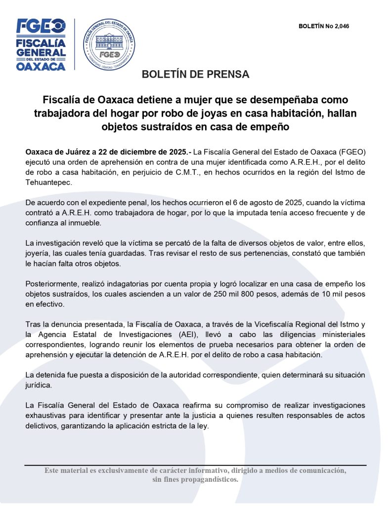 Oaxaca de Juárez a 22 de diciembre de 2025.- La Fiscalía General del Estado de Oaxaca (FGEO) ejecutó una orden de aprehensión en contra de una mujer identificada como A.R.E.H., por el delito de robo a casa habitación, en perjuicio de C.M.T., en hechos ocurridos en la región del Istmo de Tehuantepec.