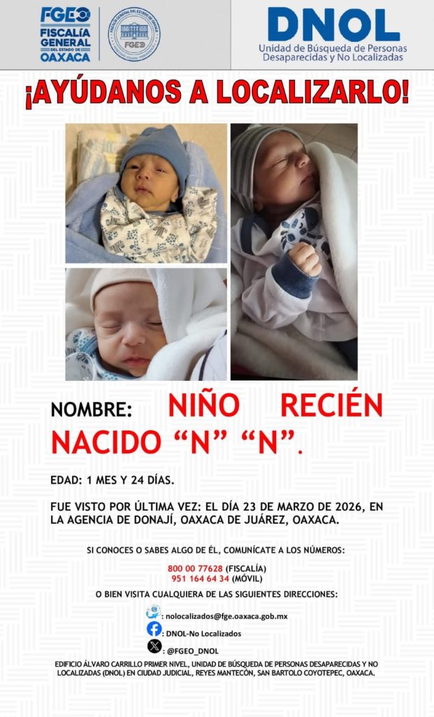 Oaxaca de Juárez, Oax., a 15 de abril de 2026.- Tras recibir la denuncia formal por la ausencia del recién nacido identificado con las iniciales “N” “N”, la Fiscalía General del Estado de Oaxaca (FGEO) activó de manera inmediata los protocolos de búsqueda y localización, así como la emisión de una Alerta Amber para garantizar el pronto paradero del menor de edad.