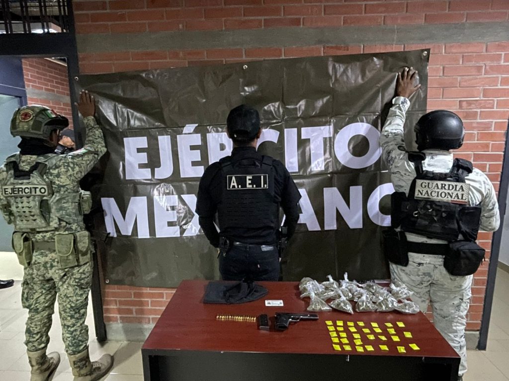 El segundo operativo se realizó en un inmueble ubicado en la calle Apolinar García, donde fue detenida una persona del sexo masculino identificada como A.E.V.M., además de asegurarse diversas dosis de sustancias con características de metanfetamina y marihuana, así como un arma de fuego.